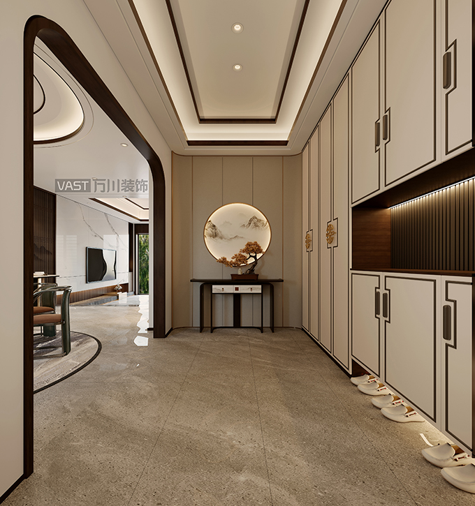玄關(guān)中直線裝飾的使用,反映出追求簡(jiǎn)單的生活的居住要求,更迎合了中式風(fēng)格追求內(nèi)斂,質(zhì)樸的設(shè)計(jì)風(fēng)格