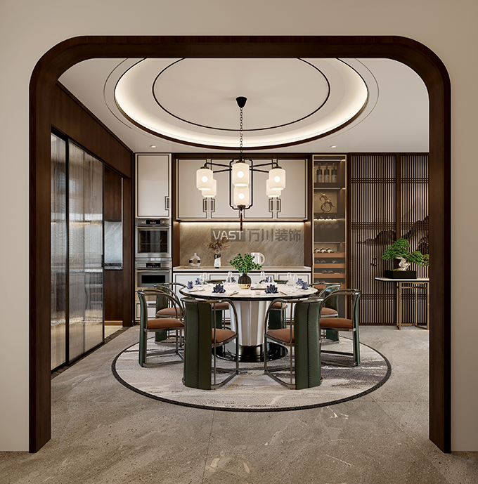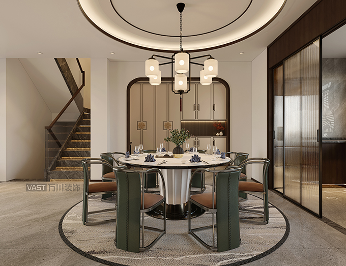 餐廳給人莊重和雅致的雙重感受,在這個(gè)空間內(nèi)可以享受平淡的幸福生活,餐廳用圓形的設(shè)計(jì),精致大氣的家居擺設(shè),滲透出濃濃的古韻風(fēng)味