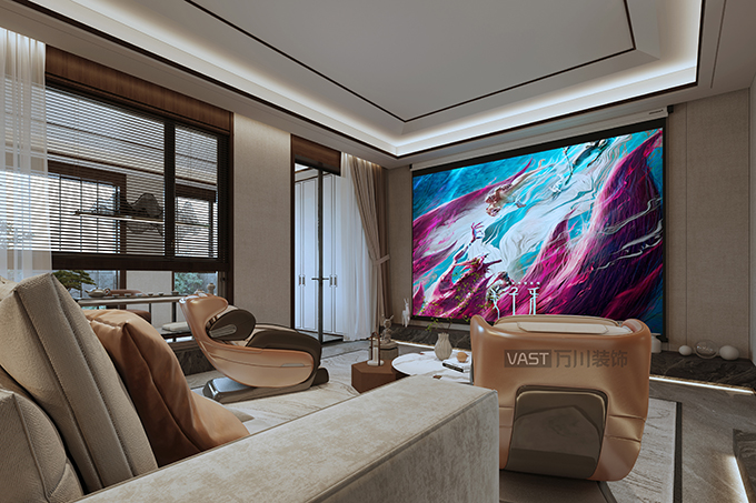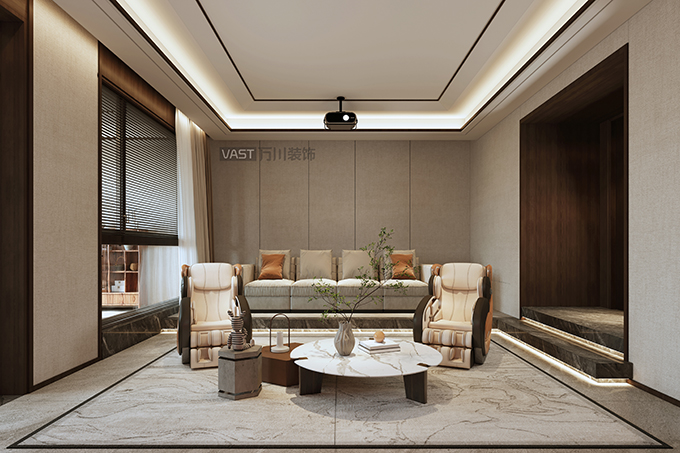 影視廳的融入增加了家中的儀式感;休息之日、閑暇之時(shí),一家人在這里看一部電影,更加深家庭互動(dòng),或者是邀請(qǐng)三五好友增加友情的堅(jiān)固