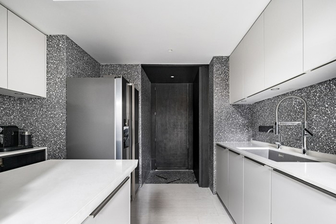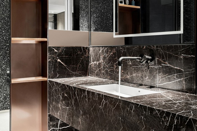 臺(tái)面與墻面交接區(qū)域設(shè)置擋水條,如果墻磚鋪貼的平整度不好,容易在臺(tái)面和墻面之間產(chǎn)生縫隙,而后擋水能夠有效的填補(bǔ)兩者之間產(chǎn)生的縫隙,在視覺(jué)上起到美觀收口的作用。