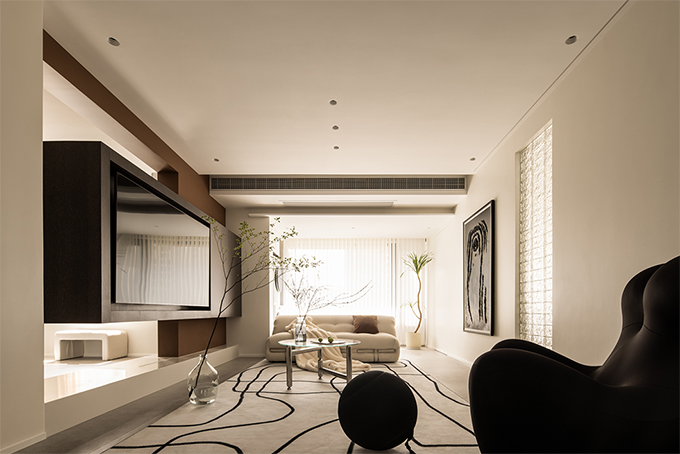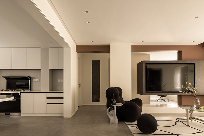 垂拔挺立的超高柜門,除去了把手的多余突兀感,給人的第一感覺更像是抽了縫的墻面,抽縫的線條也賦予了塊面的層次感和流動感,讓整個柜門看上去并不會單調(diào)乏味,上下連貫垂拔,左右連續(xù)的超高柜門,形成的多層次塊面讓空間的整體性更強。